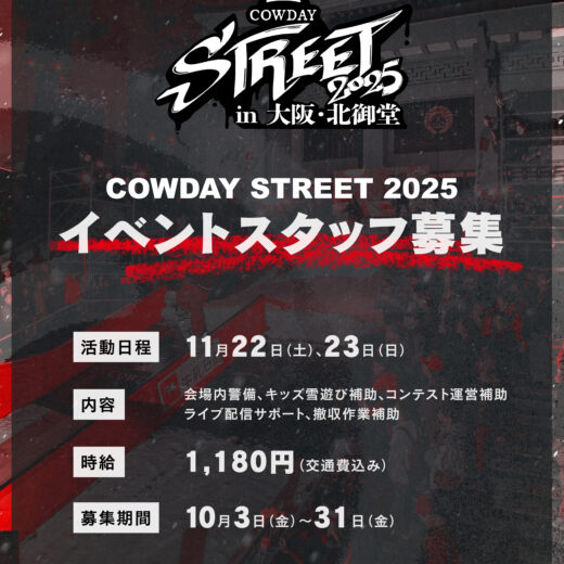 COWDAY STREET COWDAY STREET 2025 0 イベントスタッフ募集のお知らせ COWDAY STREET / COWDAY STREET 2025 2025年10月4日 COWDAY実行委員会では「COWDAY STREET 2025」の開催にあたり、会場準備や当日の運営をサポートし...
